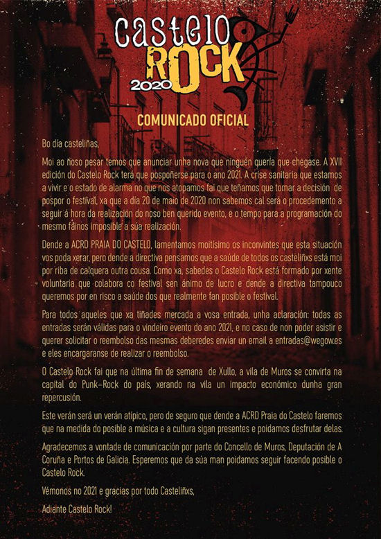 Comunicado oficial del Castelo Rock respecto a la edición de 2020, son malas noticias ya que este año tendrán que aplazar el evento al 2021