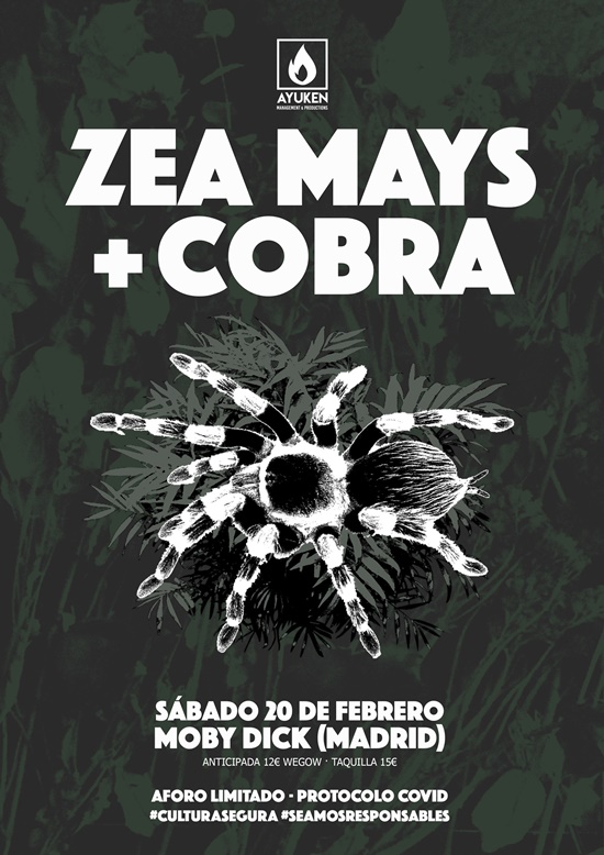 El concierto de Zea Mays y Cobra de la Moby Dick programado para el viernes 6, queda aplazado por las restricciones por zonas en Madrid que afectan a la sala, la nueva fecha será el sábado 20 de febrero.