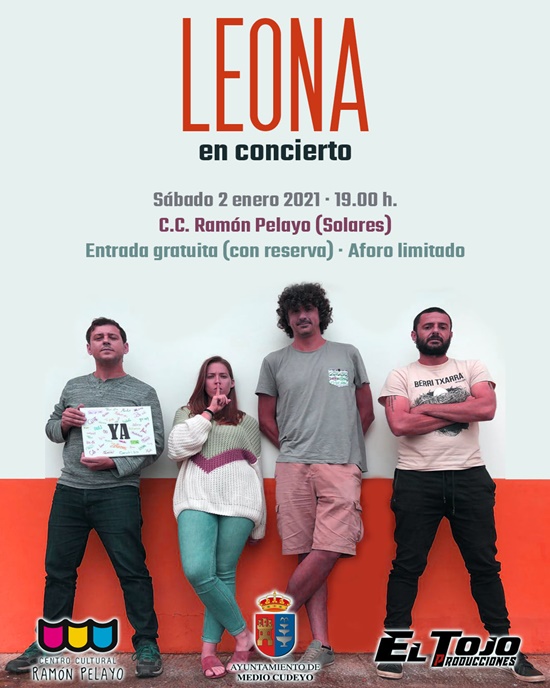 Los cántabros Leona confirman concierto para el sábado 2 de enero en el C.C. Ramón Pelayo de Solares a eso de las 19:00 h. Entrada gratuita con reserva ya que el aforo es limitado. Puedes reservar tu entrada en: 942 522 685 (llamada o Whatsapp) Por correo electrónico: centrocultural@mediocudeyo.es