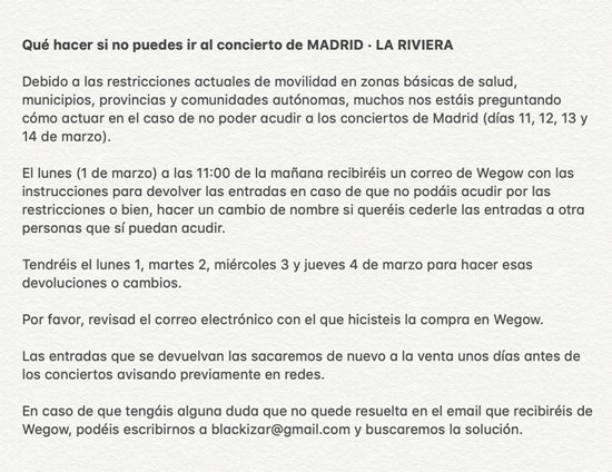 Si no puedes acudir a ninguno de los conciertos de La M.O.D.A. en Madrid del próximo mes de marzo por temas de movilidad de zonas básicas de salud, la banda informa de los pasos que tienes que realizar para devolver tu entrada.