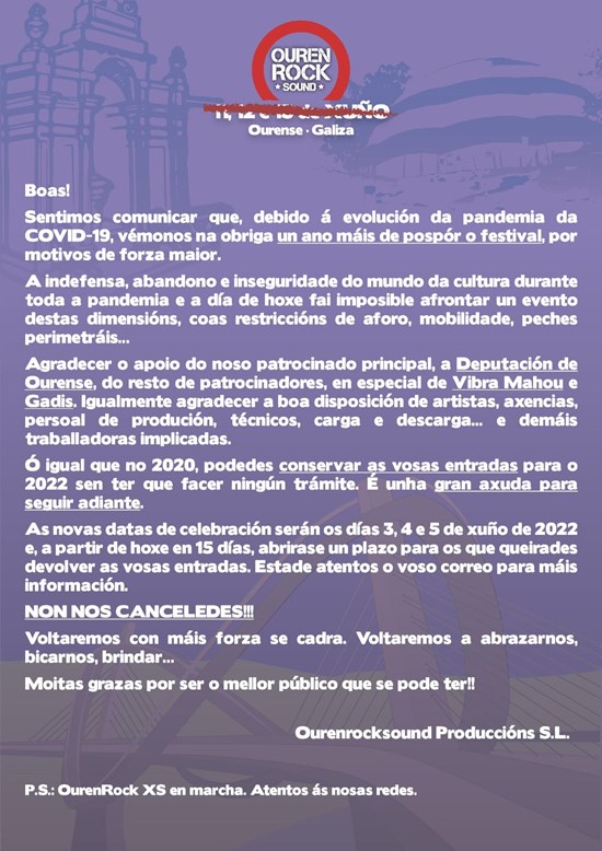 Comunicado del OurenRock Sound anunciando el aplazamiento de la presente adición a los dÃas 3, 4 y 5 de junio de 2022: