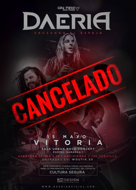 Cancelada la fecha de Daeria en Vitoria-Gateiz programada para el 15 de mayo, es por motivos personales d ela banda, la dificultad de compaginar agenda con la sala, las entradas compradas para este dÃa 15, serán devueltas.