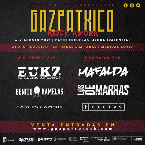Edición 2021 Cultura Segura del Gazpatxo Rock denominada Gazpatxico Rock Ayora, los dÃas 6 y 7 de agosto en el Patio Escuelas, obviamente en Ayora, Valencia. Mafalda, Los de Marras, EUKZ, Benito Kamelas... Entradas hoy a la venta en www.gazpatxorock.com, primer dÃa 18 euros, segundo dÃa 20 euros y bono a 33 euros.