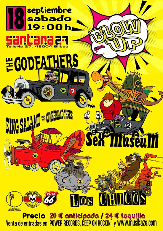 Cartel del Blow Up Fest en la Santana 27 de Bilbao, con The Godfathers, King Salami, Sex Museum y Los Chicos, sábado 18 de septiembre. Entradas en musikaze.net. Las entradas fÃsicas en Power Records de Bilbao y Keep On Rockin Bilbao.