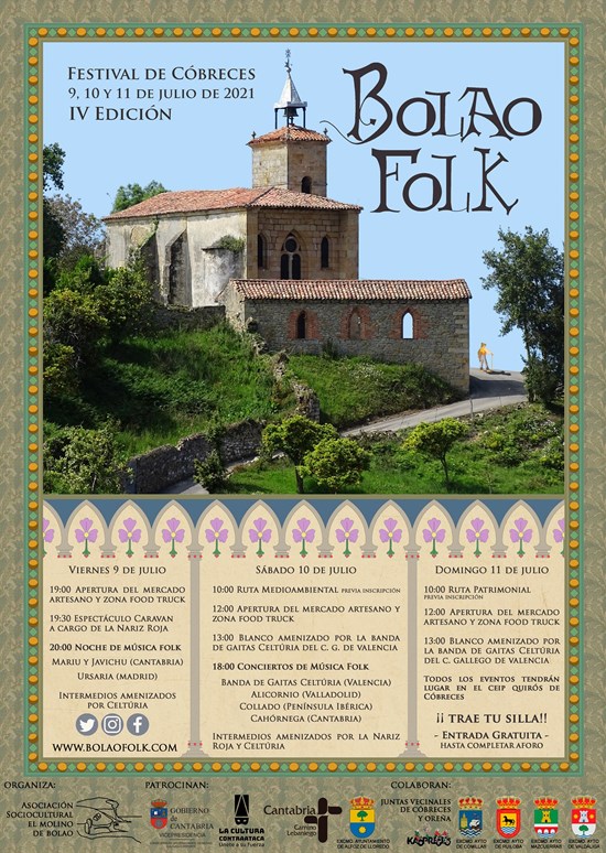 Presentamos el cartel de la IV edición de Bolao Folk con la ermita de Santa Ana de fondo. Se celebrará durante los dÃas 9, 10 y 11 de julio en Cóbreces (Cantabria), contará con música folk de la mano de Mariu y Javichu , Ursaria , Celtúria , Alicornio , Collado project , Cahornega y La Nariz Roja . Además habrá un mercado artesano con más de 40 puestos venidos desde toda España y zona food truck. Co