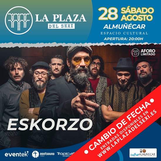 Por motivos logÃsticos Covid-19 se aplaza el concierto de Eskorzo en La Plaza del Sexi en Almuñécar al sábado 28 de agosto. Las entradas adquiridas son válidas para la nueva fecha, pero si no te viene bien puedes pedir la devolución hasta el 26/07 solicitándola en este email: plazadelsexi@gmail.com desde el email con el que realizaste tu compra y añadiendo el código de tu entrada.