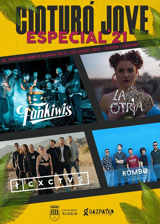 Cinturó Jove Especial 2021 el lunes 2 de agosto con entrada gratuita en Aldaia, con Funkiwis, Rumbo a Flavia, Cactus Troop y La Otra. Repetimos, gratis con orden de llegada.