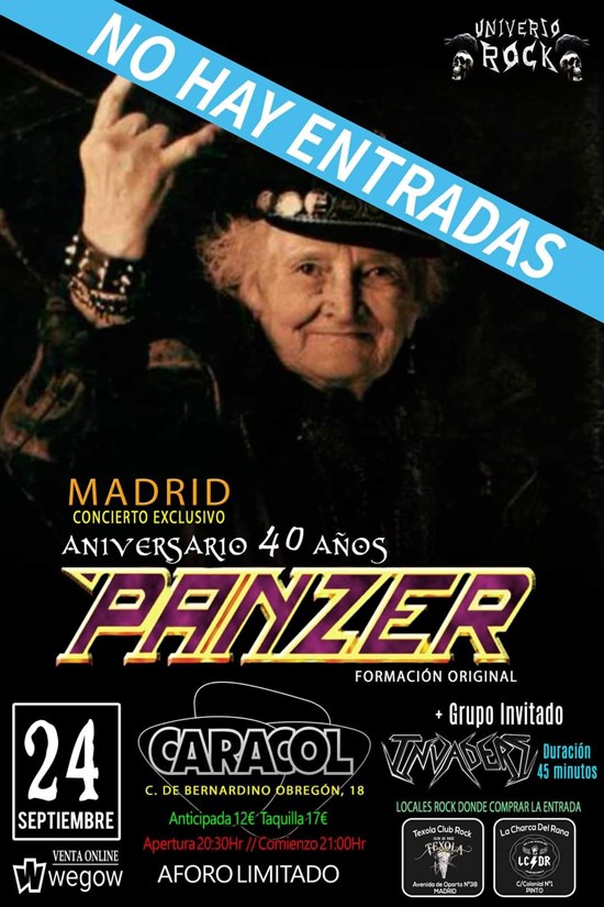 A dÃa de hoy, no hay entradas para ver a Panzer el 24 de septiembre en la Caracol de Madrid para celebrar los 40 años de la banda, pero hay esperanzas, si todo va bien habrá ampliación de aforo y por consiguiente, nuevas entradas a la venta.