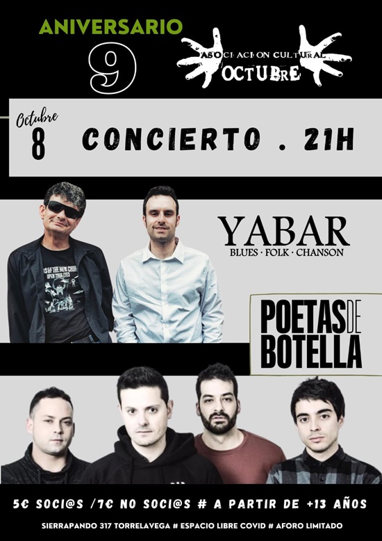 Yabar y Poetas de Botella, seguirán celebrando los 9 años de historia de la Asociación Cultural Octubre este viernes 8 de octubre a eso de las 21:00 h. 5 euros los socios y 7 euros los no socios.