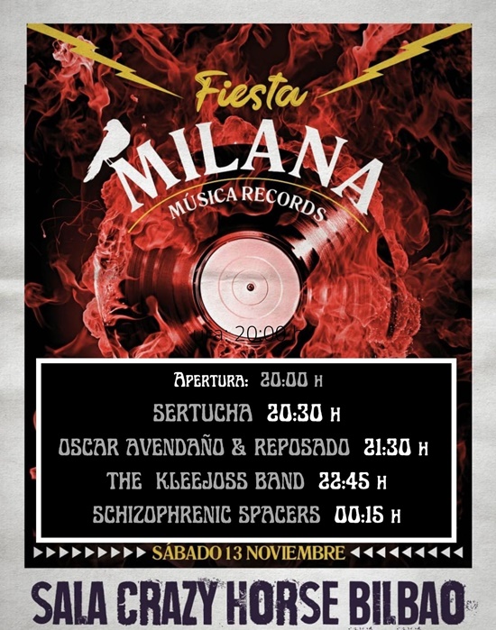 Horarios de la Fiesta del sello Milana Récords de este sábado en el Crazy Horse de Bilbao con Sertucha, Oscar Avendaño & Reposado, The Kleejoss Band y Schizophrenic Spacers. Entradas 16 euros anticipada y 19 en taquilla. Os dejamos el cartel en la noticia extendida.