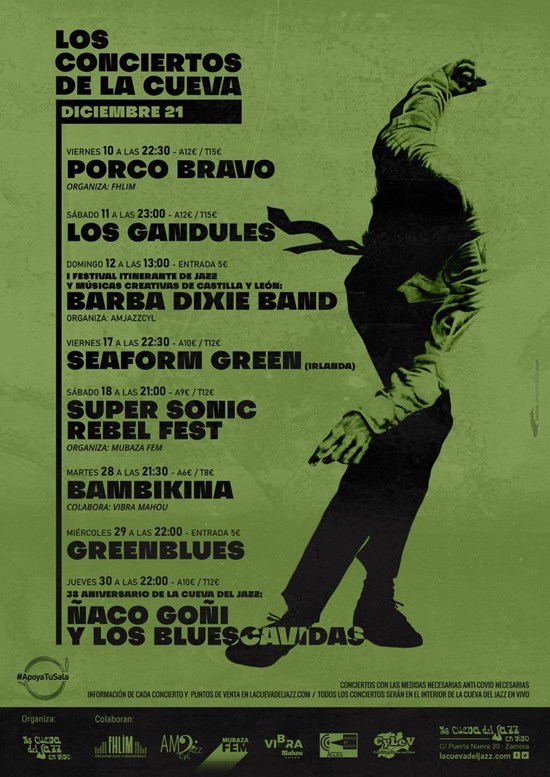 Agenda cultural de La Cueva del Jazz de Zamora para el mes de diciembre, este viernes Porco Bravo, el sábado Los Gandules y para más adelante, Seaform Green, Super Sonic Rebel Fest, Bambikina...