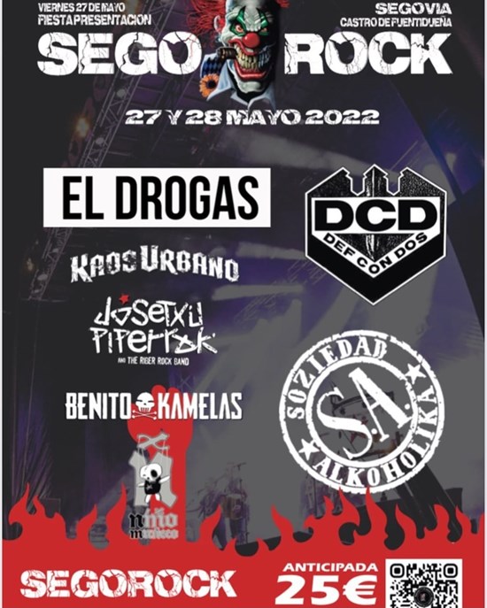 Soziedad Alkohólika, El Drogas, Benito Kamelas, Kaos Urbano, Josetxu Piperrak y Def Con DOS estarán en Castro de Fuentidueña, Segovia en el Festival Segorock 2022 para el 27 y 28 de mayo.