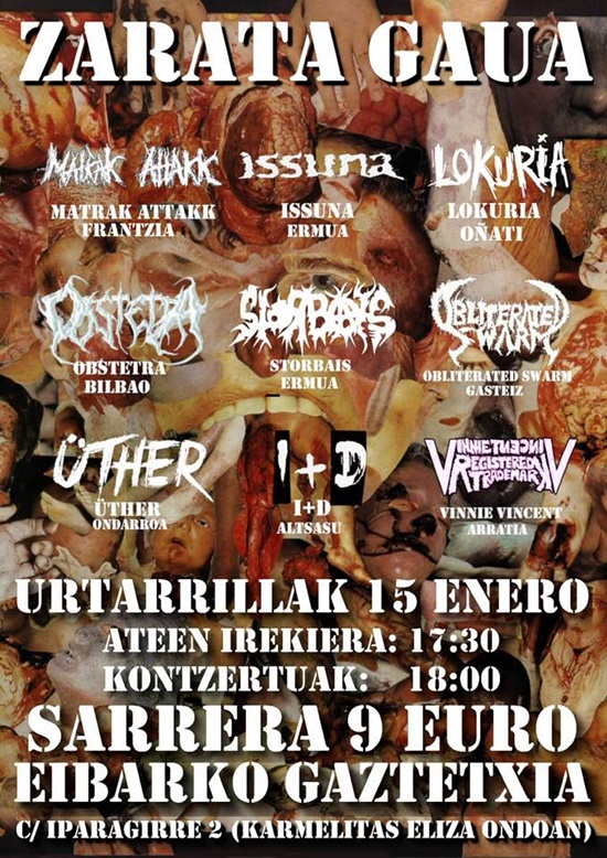 Cartel del Festival Zarata Gaua para el 15 de enero en el Gaztetxe de Eibar, con Storbais, Issuna, Lokuria, Uther... Entradas a 9 euros y hora de inicio 18 horas