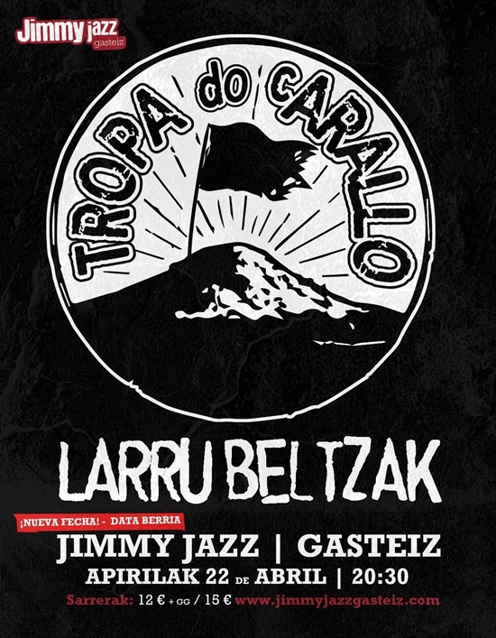 El 22 de abril es la nueva fecha para ver en Vitoria-Gasteiz, Sala Jimmy Jazz a Tropa Do Carallo y Larru Beltzak. Las entradas serán válidas para la nueva fecha, pero si no podéis acudir, escribid un email a sarrerak@jimmyjazzgasteiz.com antes del 14 de Febrero (inclusive) para solicitar la devolución del dinero (por favor especificar de qué concierto se trata).