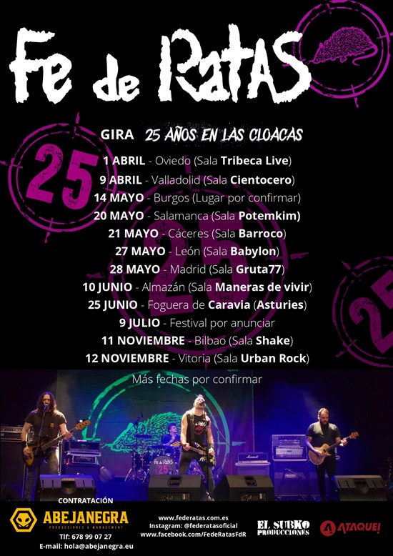 Aquà tenéis las primeras fechas de la gira "25 años en las cloacas" de Fe de Ratas. Faltan fechas por confirmar y las que puedan ir surgiendo. (Entradas a la venta próximamente)