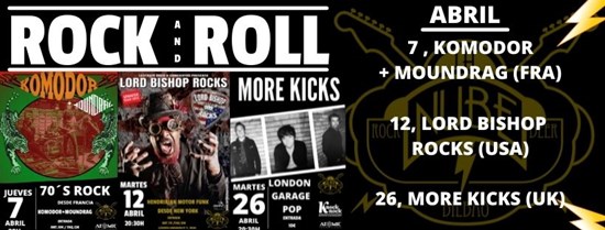 El Cafe Teatro La Nube nos deja la agenda de conciertos del mes de abril con 3 bolos confirmados: Los franceses Komodor y Moundrag, los americanos Lord Bishop y los ingleses More Kicks