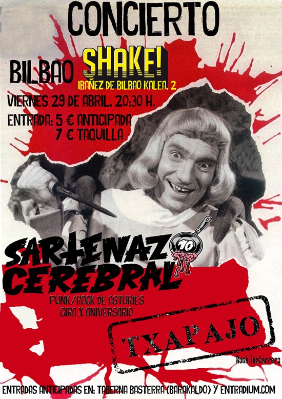 El grupo de punk/rock de Avilés, Sartenazo Cerebral, arrancará en Bilbao su gira X Aniversario. Será el viernes 29 de abril en la Sala Shake a partir de las 20:30 h, y estarán acompañados por Txapajo con su rock txatarrero desde Barakaldo.