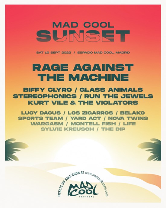 Rage Against the Machine, Biffy Clyro, Glass Animals, Stereophonics, Run the Jewels, Kurt Vile & The Violators, Lucy Dacus, Los Zigarros, Belako, Sports Team, Yard Act, Wargasm, Nova Twins, Montell Fish, Life, Sylvie Kreusch & The Dip formarán parte del cartel de Mad Cool Sunset y serán los encargados de hacer flipar al personal y de hacernos pasar un día in-ol-vi-da-ble.