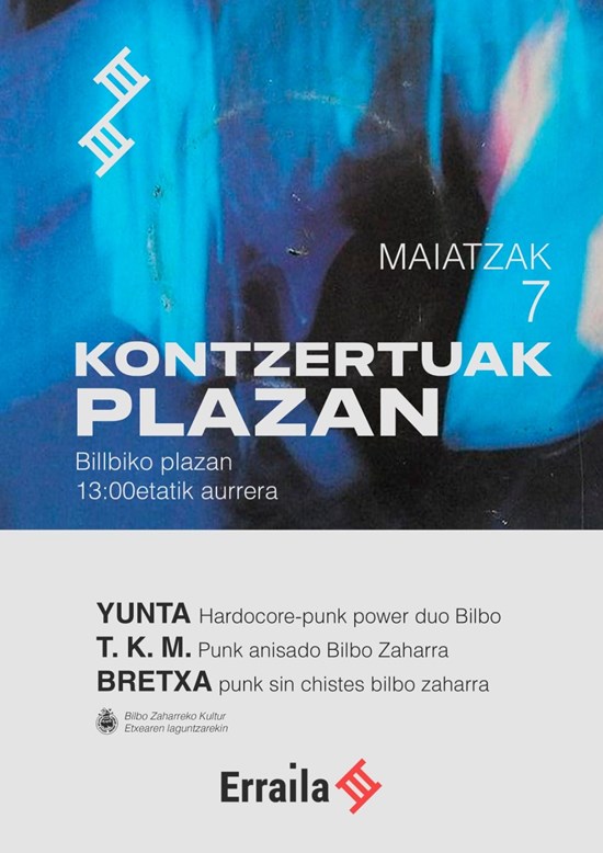 Este sábado 7 de mayo, en la Plaza del barrio Bilbao La Vieja, en el casco Viejo, habrá concierto matinal con Yunta, T.K.M y Bretxa. Concierto gratuito a partir de las 13 horas.