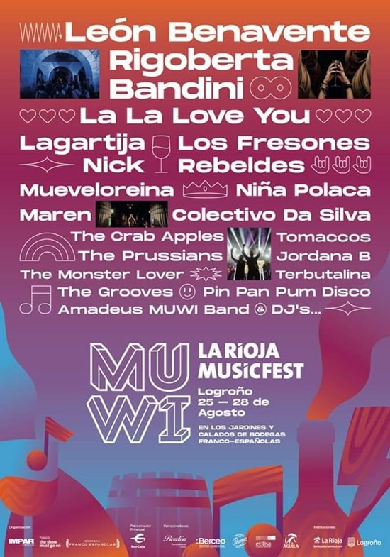 Cartel del Muwi Fest La Rioja MusicFest 2022, del 25 al 28 de agosto en los jardines de las bodegas Franco Españolas de Logroño. Música & Vino en una Bodega Riojana con bandas como Leon Benavente, Lagartija Nick, Los Fresones Rebeldes... www.muwi.es