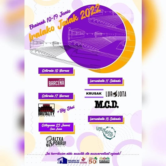 Cartel para las fiestas del barrio bilbaíno de Irala, que irán desde el viernes 10 de junio hasta el sábado 18 de junio. MCD, Lur Jota, Urratz...