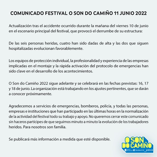 Actualización tras el accidente ocurrido durante la mañana del viernes 10 de junio en el escenario principal del festival, que provocó el derrumbe de su estructura: