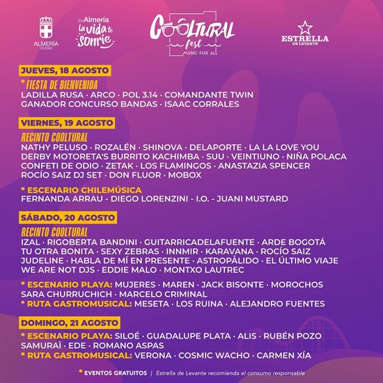 Cooltural Fest desvela distribución del cartel por jornada y lanza un cupo de entradas limitadas para cada dÃa. El festival almeriense abre también la reserva de los alojamientos oficiales tanto en camping Cooltural Rest como en la Residencia Civitas. Las distintas modalidades de alojamiento se puede consultar a través de la propia web del festival. www.coolturalfest.com.