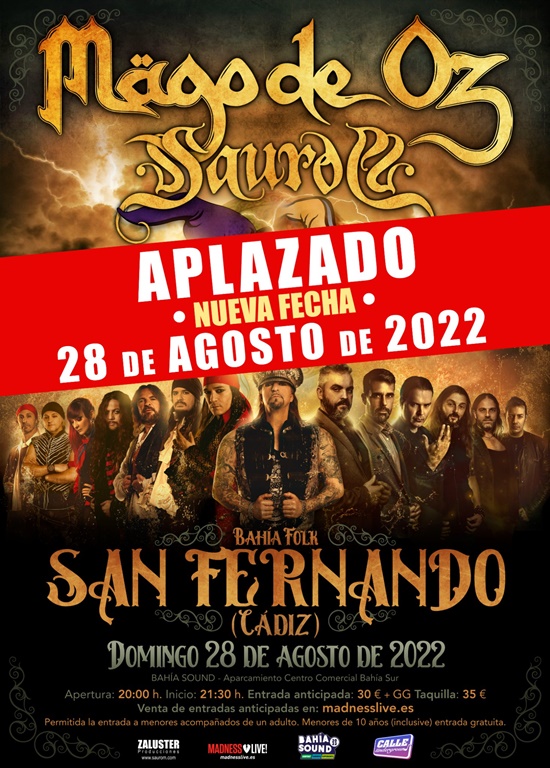 El concierto de Saurom y Mägo de Oz de San Fernando, Cádiz, pasa al 28 de agosto, ya sabéis que los dos cantantes de Mägo son baja por enfermedad, motivo principal por el cual también suspendieron su presencia en el Leyendas del Rock