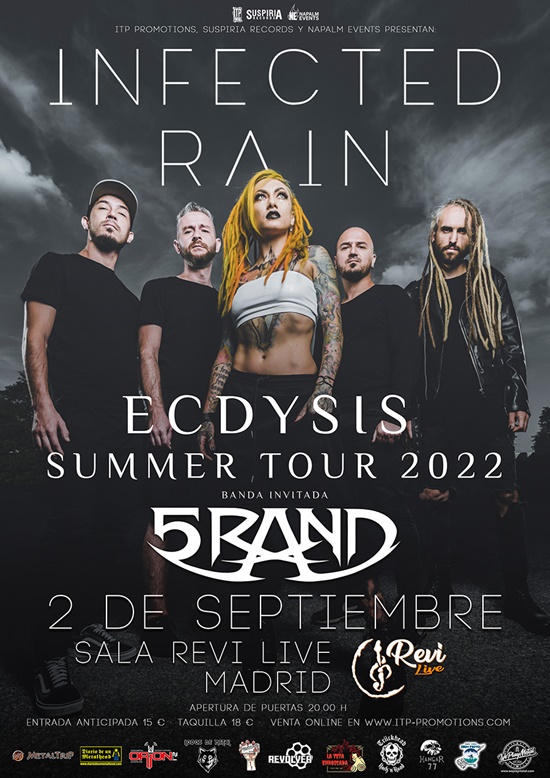 Cambios para el concierto de Madrid de Infected Rain y 5Rand de este viernes, 2 de septiembre. La nueva ubicación para el concierto será la Sala Revi Live. Se mantiene la apertura de puertas a las 20.00h y las entradas son todas válidas.