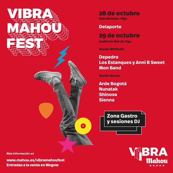 Vibra Mahou Fest regresa a Vigo los dÃas 28 y 29 de octubre, lo hará de la mano de Delaporte, Depedro, Los Estanques y Anni B Sweet, Mon Band, Arde Bogotá, Nunatak, Shinova, Sienna y diferentes DJs. · Las entradas ya están disponibles en tres distintas modalidades: Abono general, entrada sesión mediodÃa y entrada sesión de noche. Más info en www.mahou.es/vibramahoufest