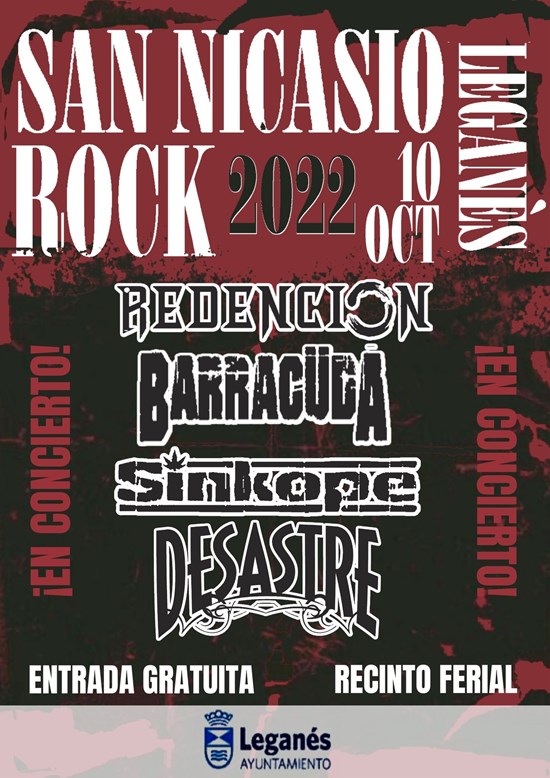 Estos son los horarios del San Nicasio Rock de este año, lunes 10 de octubre en Leganés, allà veremos a estas estupendas bandas. 20:45 H Redencion 21:45 H Barracüda 23:05 H Sinkope 00:50 H Desastre